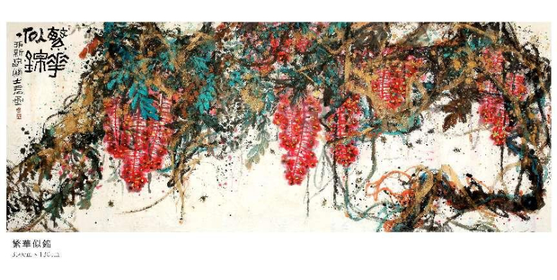 《繁花似锦》是一幅饱满的春天画作。君寿笔下的藤萝以豪锋大笔,不时变换托、逆、侧、横的笔法,把藤蔓跃然纸上,焦墨皴笔的藤蔓融入流畅的色彩,使之苍而不枯,老蔓新生,青翠的枝叶托映着灿若云霞的花朵,泼染并用、艳而不俗,整个画面的创作,给人以立体的春天感觉。