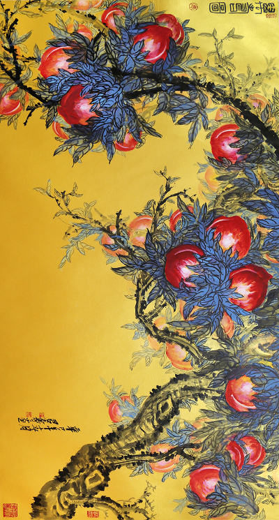 君寿笔下的寿桃,既有传统又有创新,突出了皇家富贵吉祥的气派,和色彩艳丽夺目的风格特点,此类题材作品广受收藏。