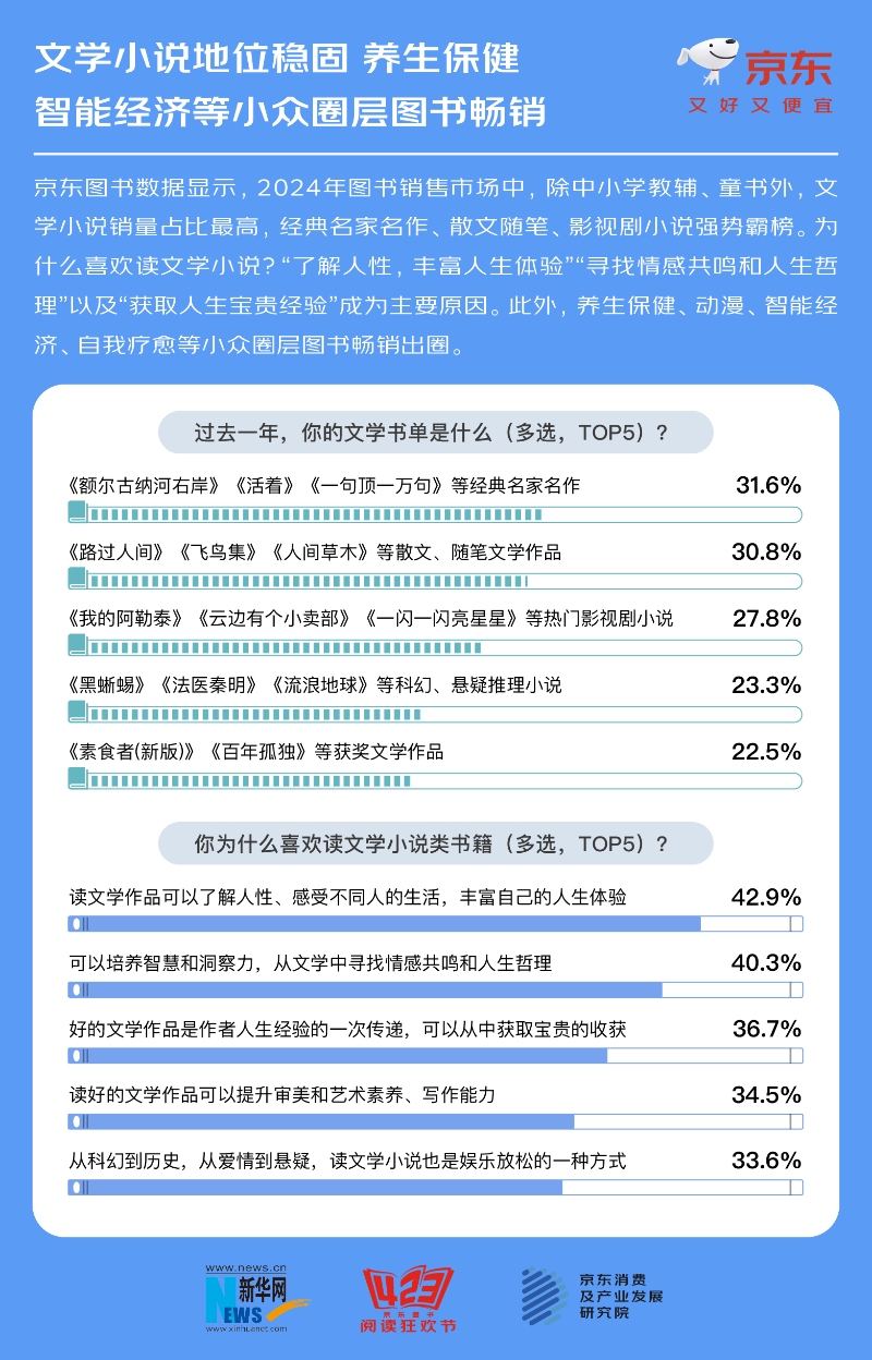 京东图书数据显示,2024年图书销售市场中,除中小学教辅、童书外,文学小说销量占比最高,名家名作、影视剧小说依然是文学畅销热点。