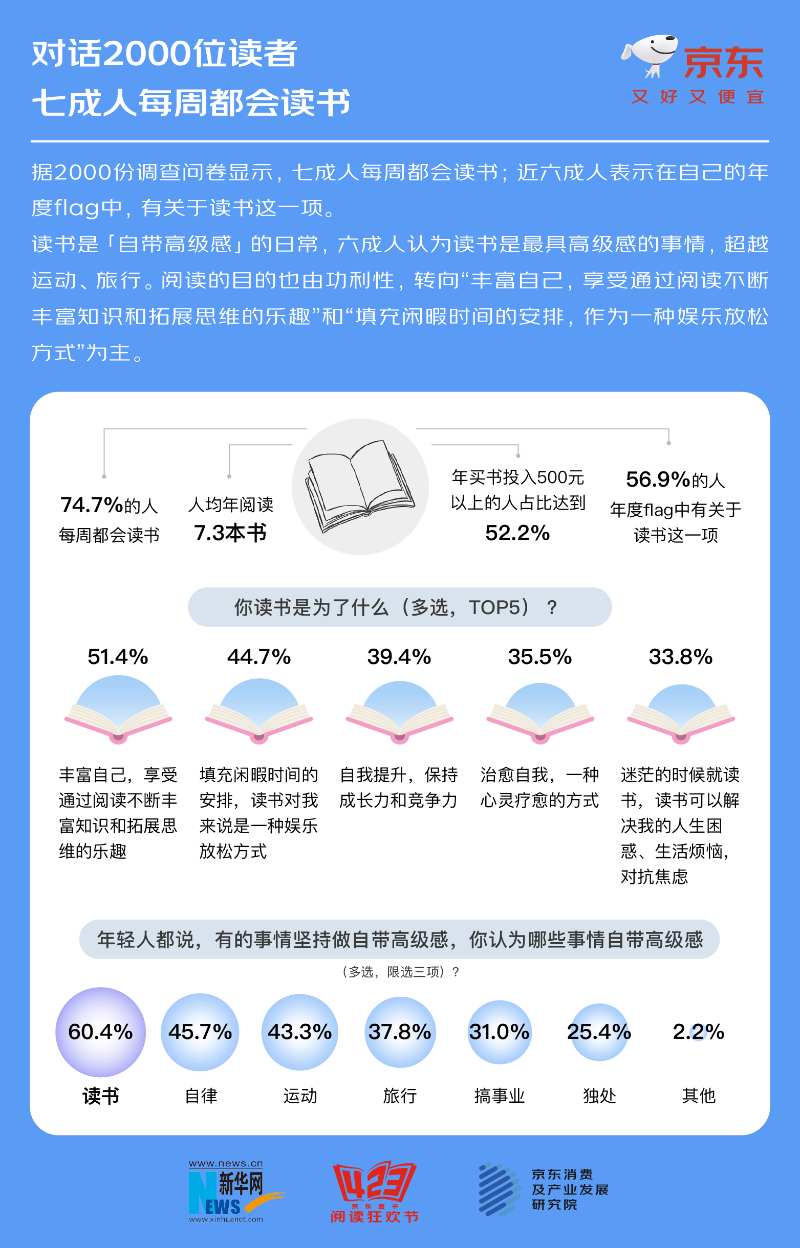 世界读书日当天,新华网联合京东图书、京东消费及产业发展研究院、京洞察共同发布了「世界读书日小调查」,通过问卷跟2000位读者“对话”了关于读书这件事儿: