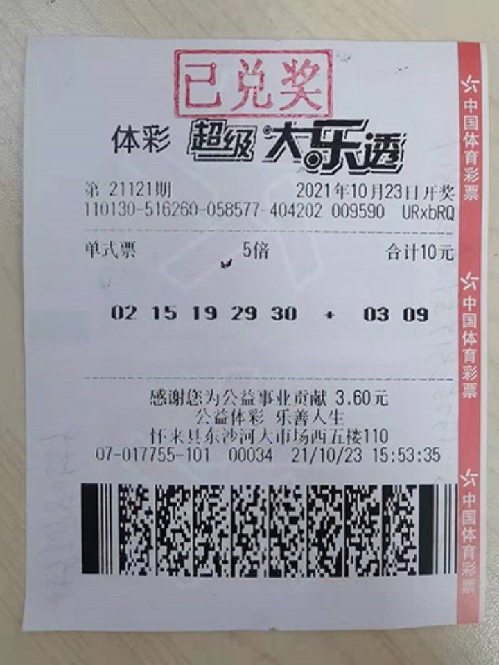 10月23日,超级大乐透第21121期前区开出号码“02、15、19、29、30”,后区开出号码“02、09”。本期全国销量为3.13亿元,为国家筹集彩票公益金1.12亿元。来自张家口怀来县购彩者的一张10元机选投注票喜中二等奖5注,单票奖金60余万元,中奖者首次中得几十万元以上大奖,虽然与一等奖擦肩而过,仍旧对这次的奖金非常满意。