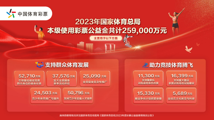 《公告》显示,2023年度,国家体育总局使用彩票公益金259000万元用于开展群众体育和竞技体育工作。在构建体育强国和健康中国的进程中,中国体育彩票发挥着不可或缺的作用。