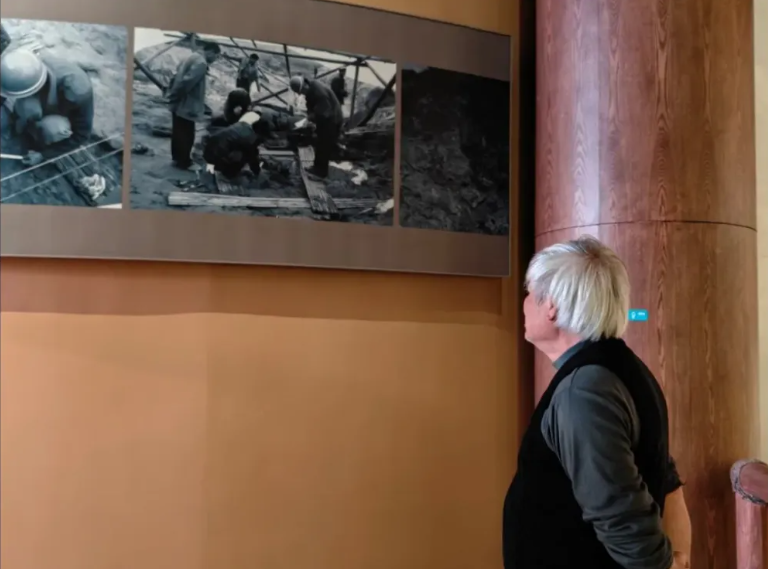 2024年4月8日,龙京沙在里耶秦简博物馆凝望2004年秦简发掘现场的照片 。新华每日电讯记者翟翔 摄