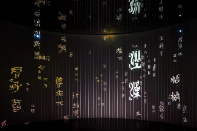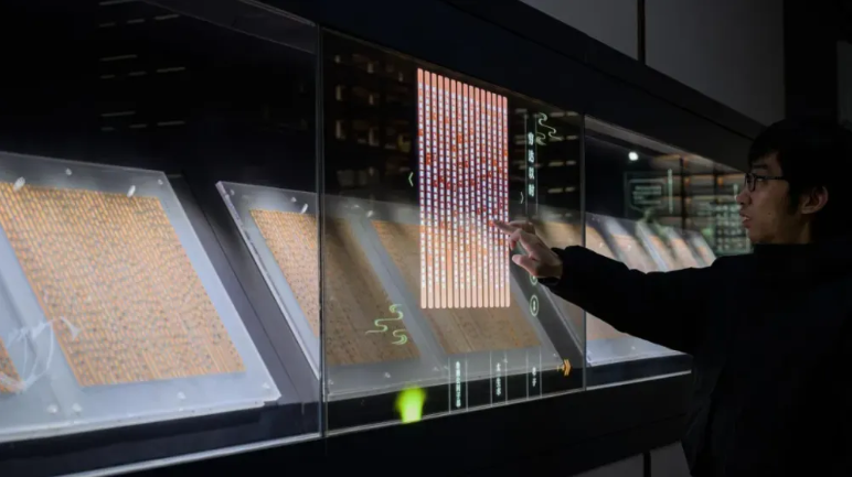 在甘肃简牍博物馆内,一枚枚简牍被放置在细细长长的玻璃管中,墨书在灯光的映衬下笼上了一层昏黄的雾。游客们沉浸在书香浓郁的展馆中,有人驻足俯身使劲靠近简牍,欲辨认细读那些文言墨字;有的人与屏幕互动,串联起不同地名的古今缘分;还有的人被装点在博物馆各处的书法之美所吸引,举起手机拍照合影。