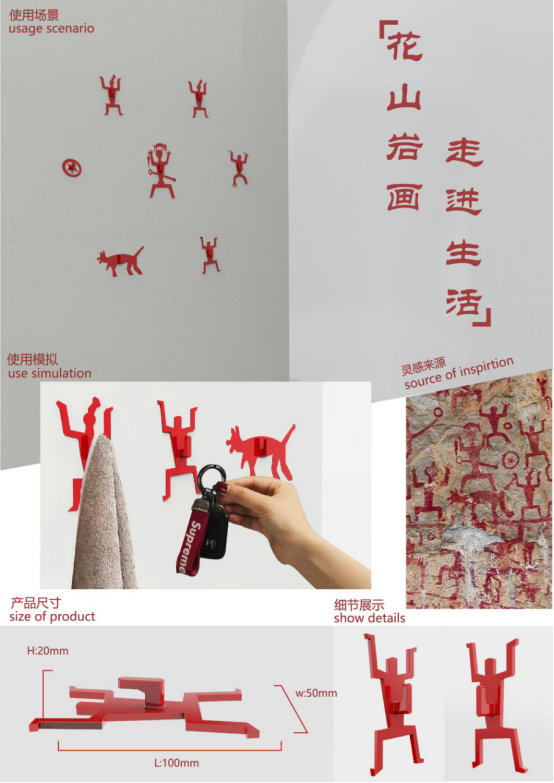 本设计旨在将花山岩画的艺术元素与现代家居生活相结合,创造出既具有文化意义又实用的挂钩产品。通过产品设计传递花山岩画的文化精髓,让更多人了解并欣赏这一古老艺术。