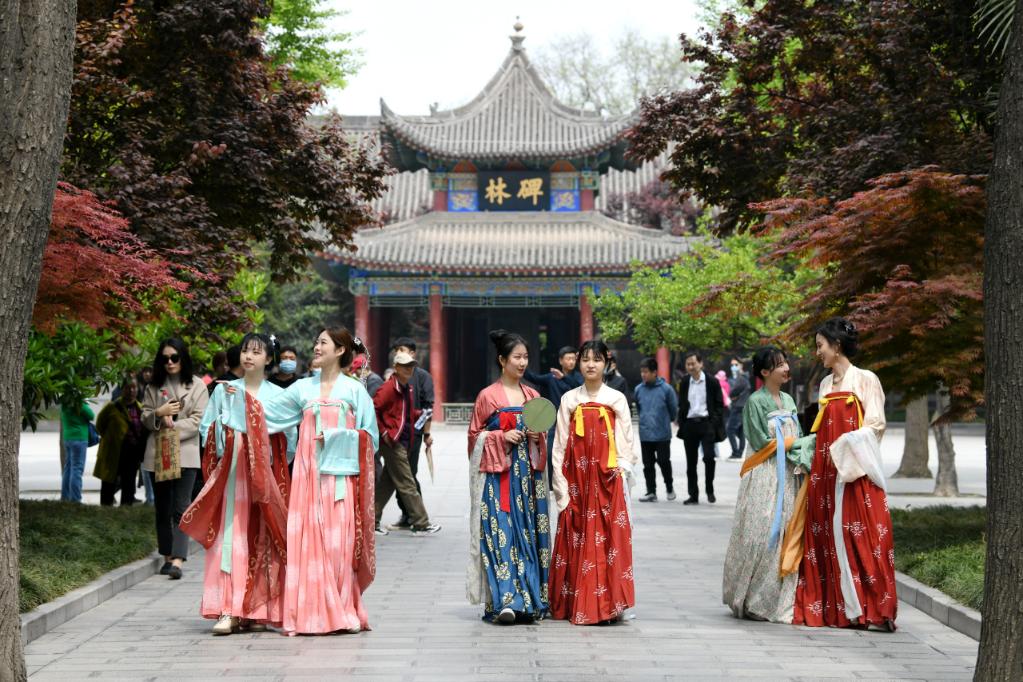 汉服爱好者在西安碑林博物馆参观 李一博 摄