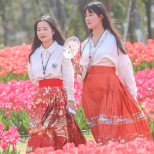 3月12日,江西南昌凤凰沟,两位身穿中国传统服饰马面裙的游客从郁金香花海中走过