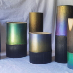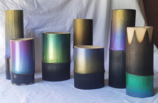 设计理念:正反向双口竹节花道瓶,是一款以火为加工要素,遵循少即是多的极简设计原则及禅意美学的竹文创产品。利用竹节作为分隔和承托物,一物两用,一举两得,根据心境或作品主题需要,来选择任意一端作为容器摆放花卉作品。
