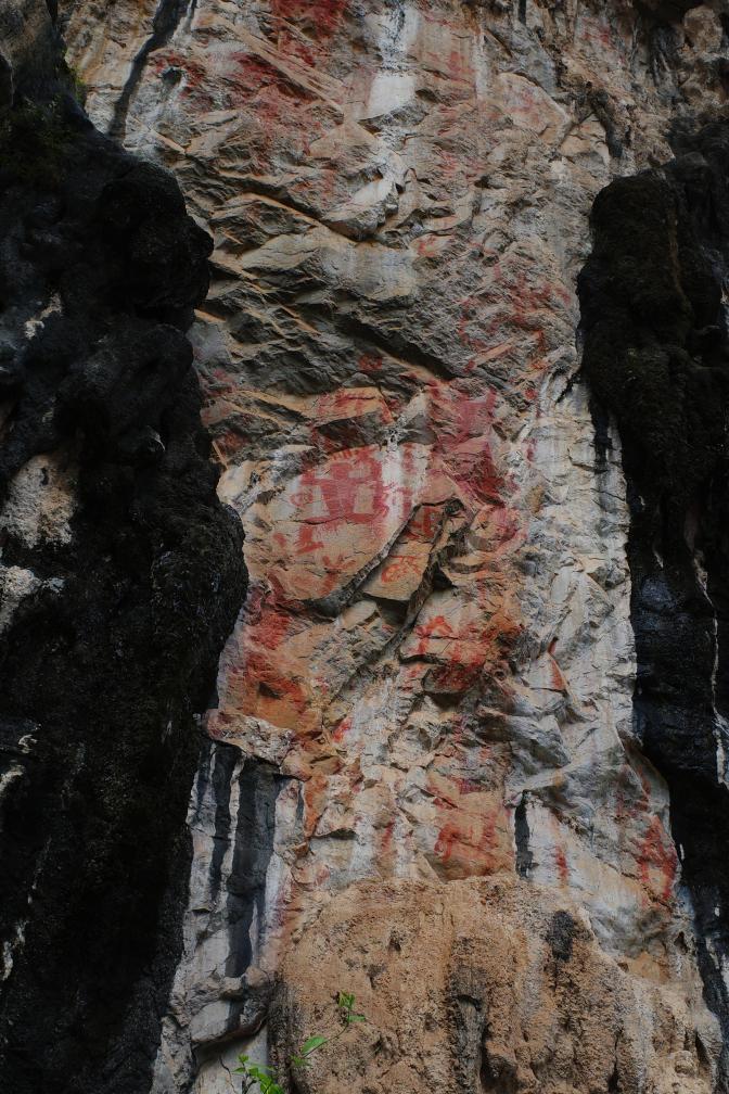 乘船数公里来到明江边的花山悬崖之下,崖壁略显内凹、层理清晰,向江边倾斜。手脚张开、铜鼓在侧、身佩环刀……多处红色人像图案就被绘于悬崖之上,这些人像图案高约0.6至1.5米,最大的高达3.58米,悠悠江水拍打堤岸,时空的画笔仿佛凝结于此。