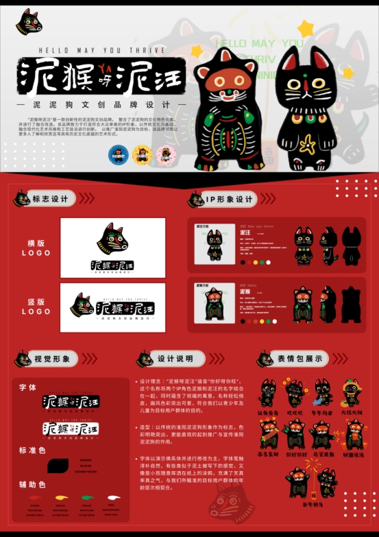 以推广非遗文化淮阳泥泥狗为目标,让更多人了解和欣赏这项具有历史文化底蕴的艺术形式。品牌名称谐音“你好呀你旺”,将两个IP角色泥猴和泥汪的名字结合在一起,寓意友好与祝福。