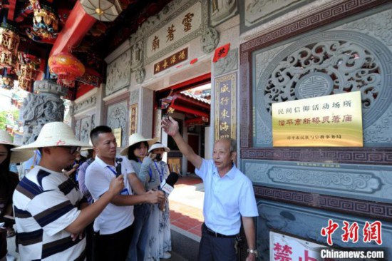 8月8日,漳平当地民俗文化研究专家卢庆顺向记者介绍刘氏九龙三公民间信仰文化。中新网记者 张金川 摄