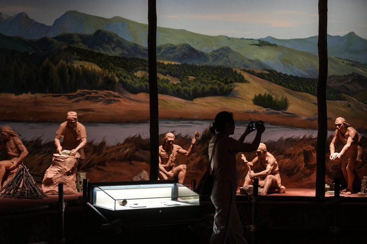 公园内近3500平方米的牛河梁遗址博物馆,修葺一新,依次分为“序厅”“红山古国”“文明发端”“人文始祖”等7个主题单元,展陈着牛河梁遗址出土的石器、陶器、玉器。序厅内巨幅360度投影屏幕还生动再现了“红山先民”当年的生产生活和祭祀场景。