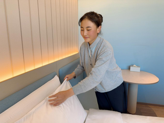 在汉庭甘孜理塘318国道酒店,19岁的藏族姑娘德西在今年3月正式成为了一名客房清洁师。在这里,德西第一次看到机器人和咖啡机,第一次吃蛋糕过生日,真正感受到了外面的世界。她的愿望是通过自己的努力供弟弟上大学,“读了大学,他以后会更有出息,生活会更丰富。”而店长也鼓励德西,“除了学历以外,通过自己的努力,在华住你也可以实现晋升,当经理、店长都有可能实现。”