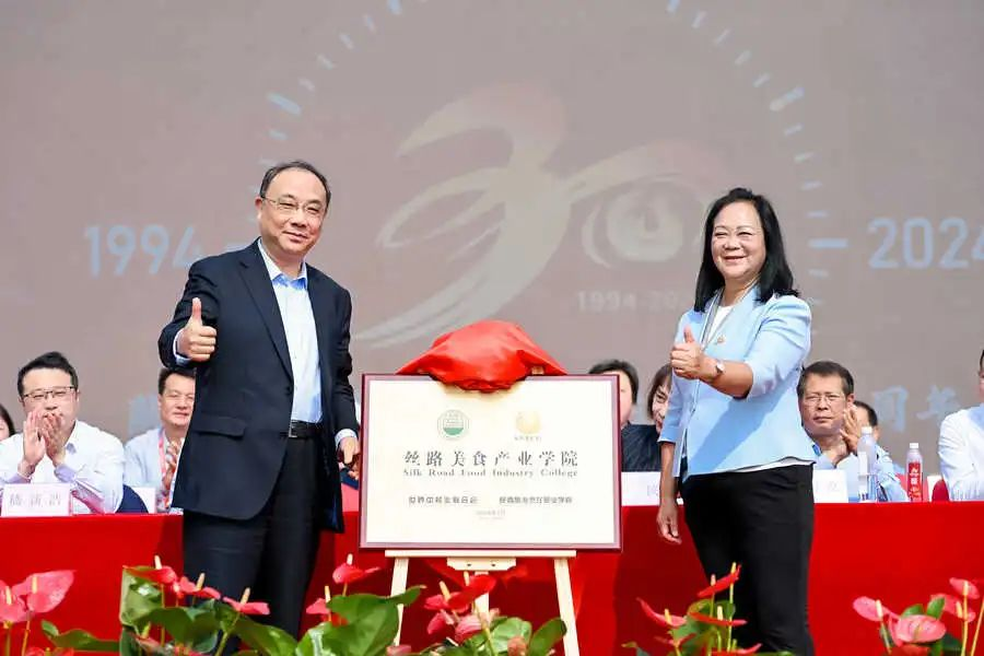 在活动中,世界中餐业联合会邢颖会长与陕西旅游烹饪职业学院王新丽院长共同为丝路美食产业学院揭牌;江苏旅游职业学院党委书记田浩与陕西旅游烹饪职业学院党委书记朱选朝共同为东西部院校合作揭牌;浙江商业职业技术学院副院长嵇新浩与陕西旅游烹饪职业学院院长王新丽共同为东西部院校合作揭牌。