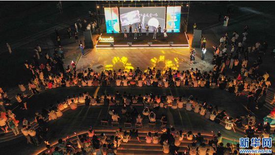 海边的阿卡贝拉唱演吸引很多游客观看(无人机照片)。新华网 肖和勇 摄