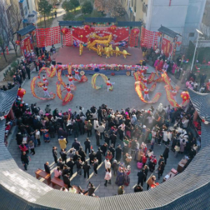 1月12日,群众在贵州省黔南布依族苗族自治州都匀市小围寨街道思源社区观看舞龙表演(无人机照片)。