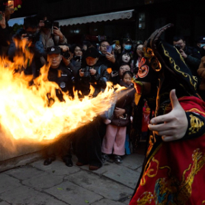 只见川剧变脸大师气宇轩昂地走上台,眼神锐利,手在脸上轻轻一抹,一张脸谱“嗖”地一下,如闪电般迅速变换成另一张;非遗绝技川剧喷火更是点燃了现场,脸部涂满油彩、身着华服的演员,手中握着特制道具,深吸一口气,胸膛高高隆起,猛地向前倾身,头部快速摆动,同时嘴巴用力一喷,刹那间,一道足有丈余的火焰喷射而出,将空气烧出“呼呼”的声响。