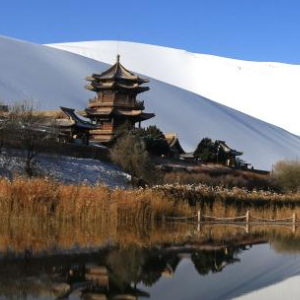 2023年11月15日拍摄的甘肃省敦煌市鸣沙山月牙泉景区雪景。张晓亮 摄