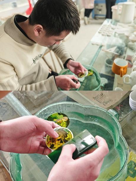 2月14日,景德镇,青年陶瓷艺术家洛深白(化名)正在对图案为“夏日荷花”的陶瓷徽章白胎进行釉上贴花。受访者供图