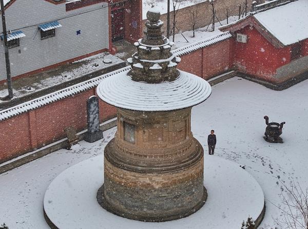 1月25日,赵波在大雪中望向泛舟禅师塔。常奇/摄