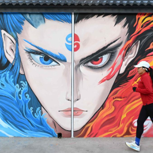 2月20日,山东省淄博市周村区沈家村村民沈靖宇从其创作的哪吒主题墙绘前走过。
