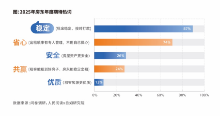 此前,“2025房东年度期待十大热词”调研数据显示,个人业主对2025年出租生活最期待的前三大关键词分别是:稳定、省心、安全。个人业主群体的出租理念、出租方法逐步转向,对于先改造后出租、配齐家电、保洁房屋等提升房屋品质、竞争力的“租前准备工作”认同度逐渐提高,同时也更愿意一步到位——将房屋直接交由长租机构进行托管运营。
