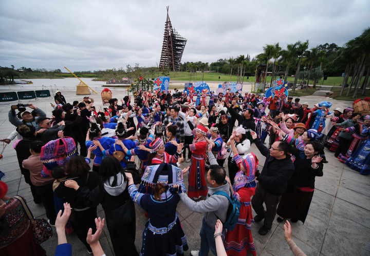 游客在广西南宁园博园跳“多耶舞”(3月29日摄)。新华社记者 周华 摄