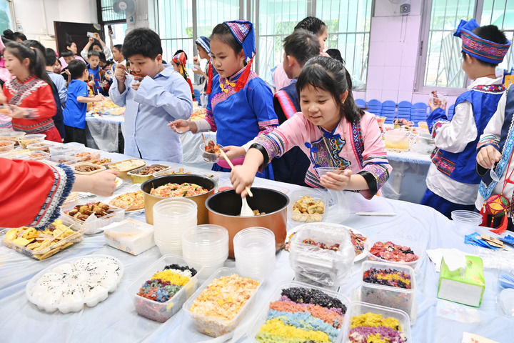 孩子们在广西南宁市民族大道东段小学品尝美食(3月27日摄)。新华社记者 周华 摄