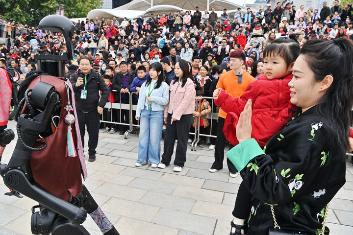 游客在南宁举行的“广西三月三·八桂嘉年华”开幕式现场跟机器人打招呼(3月31日摄)。新华社记者 周华 摄