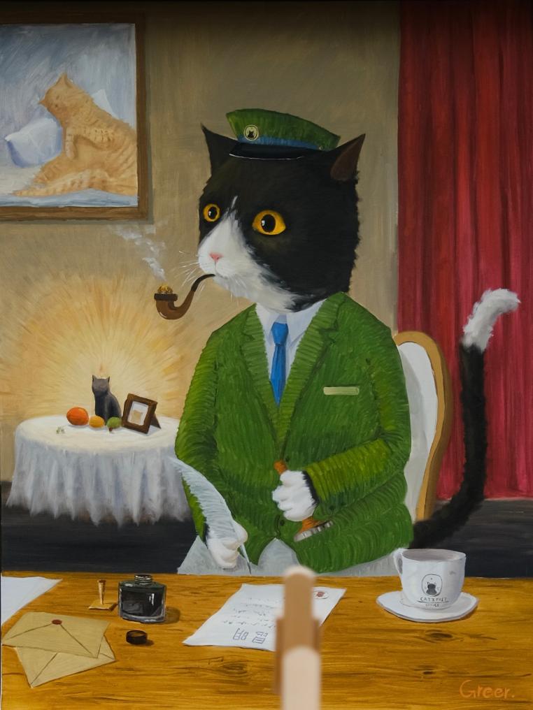 新华社昆明4月13日电(记者赵彩琳)一只黑猫头戴邮差帽,爪握邮戳,身后是滇池的翔鸥和农贸市场熙攘的人流……昆明市鼓楼路一处老花园公寓里,一幅幅画作中央端坐“黑猫局长”,尾巴轻扫过调色盘。
