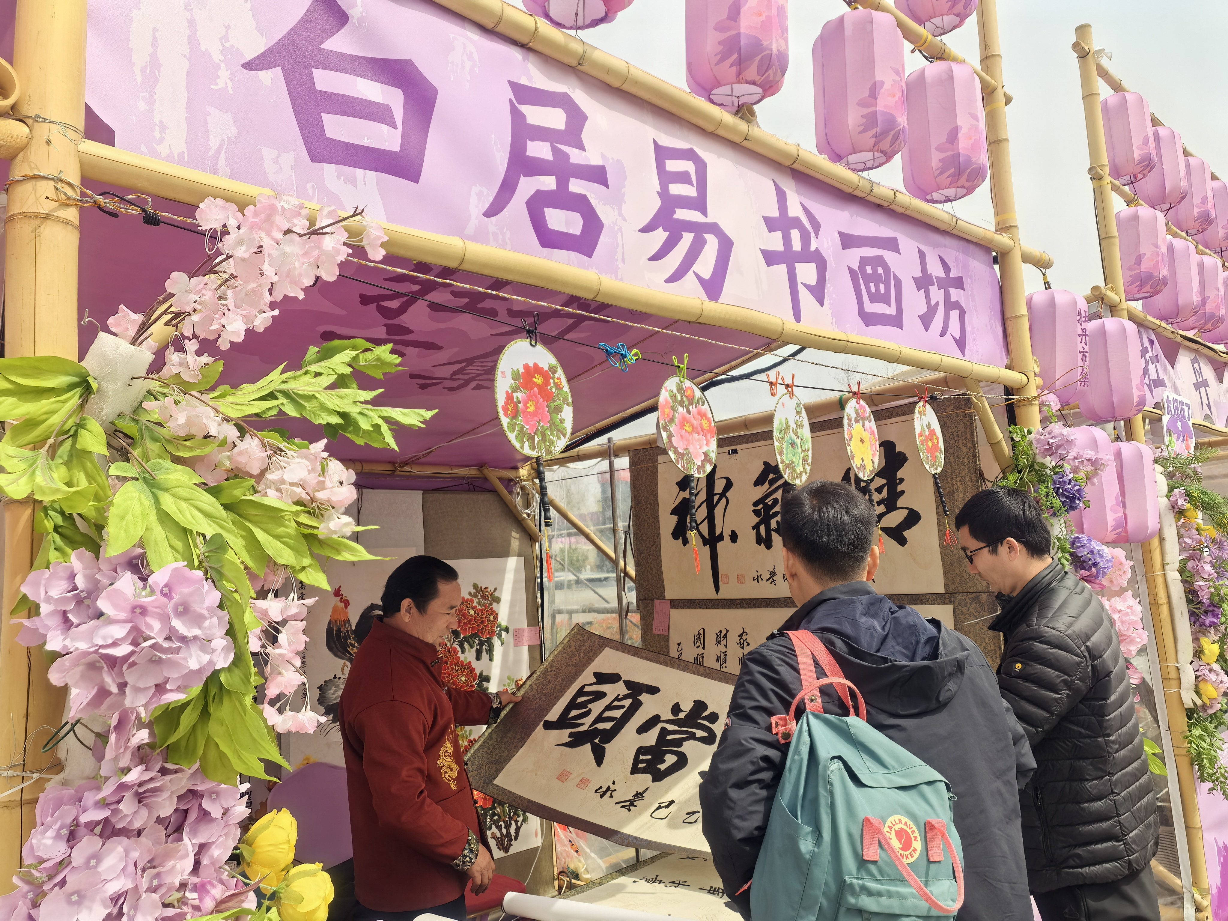 洛阳牡丹文化节期间,顾客在龙门古街的市集上选购书画作品。 本报记者 张莹莹 摄