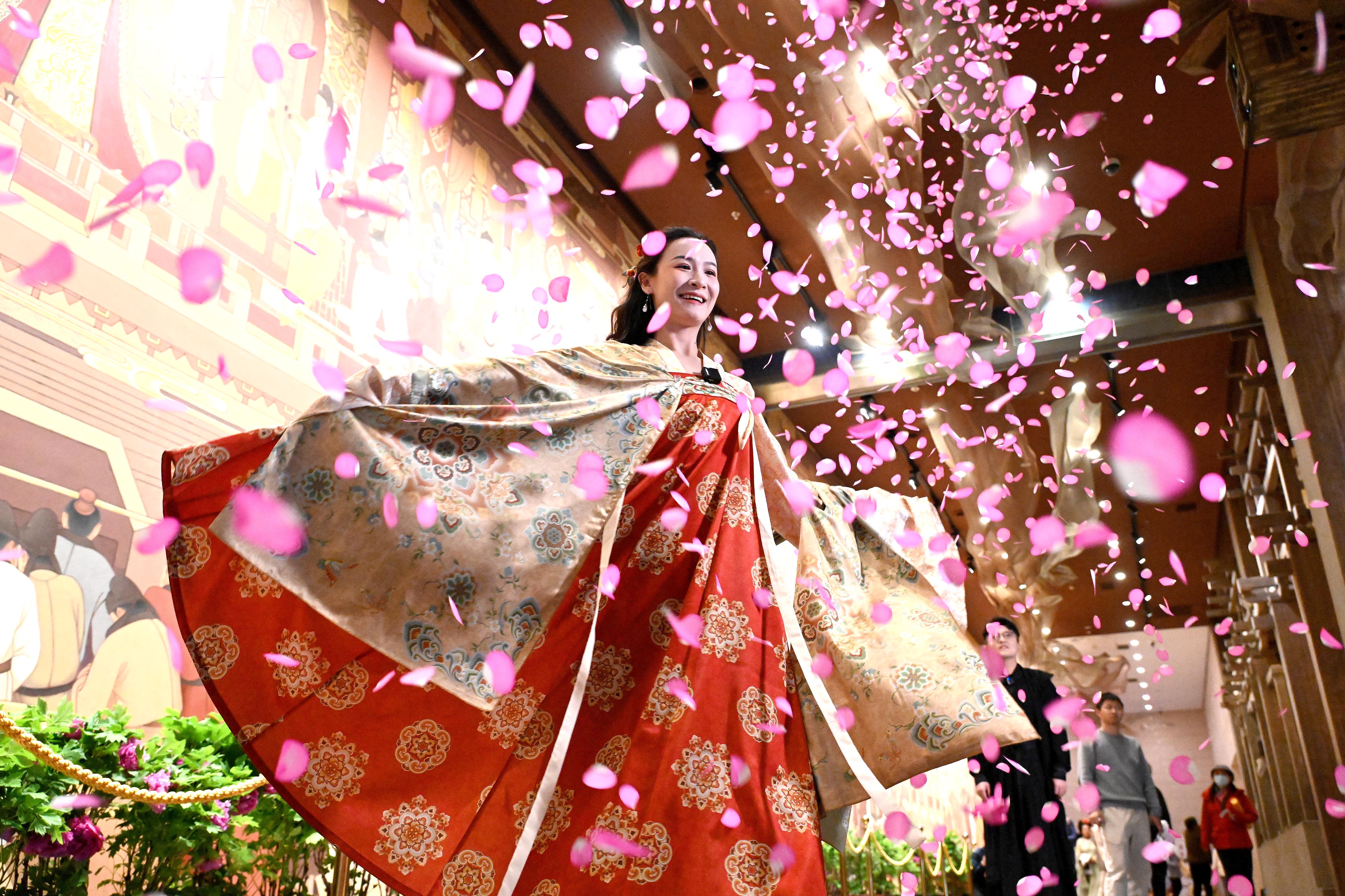在洛阳龙门古街、丽景门等历史街区看非遗传承人现场展示唐三彩烧制、牡丹瓷绘、牡丹香囊制作等技艺;亲手嫁接一株牡丹幼苗;集印章兑换特色文创;通过VR技术穿越至隋唐与古人一同赏花……重庆游客陈希溪发现洛阳可体验的项目太多,决定延长行程,再留两天。