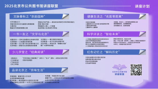 “北京市公共图书馆讲座联盟”通过7大系列50场精品讲座,让优质文化资源直达基层;“北京市诵读大赛”以纪念中国人民抗日战争暨世界反法西斯战争胜利80周年为主线,让诵读经典之声,叩响家国情怀;“十佳优读空间”通过发掘、推荐“小而美 小而优”的新型公共文化空间,织密织细身边的公共文化服务体系,助力每个人的终身学习;“阅读伴我成长”在中轴线申遗成功一周年之际,带领少年儿童行走中轴,从文本阅读到脚步丈量,体悟中华文明的独特魅力。