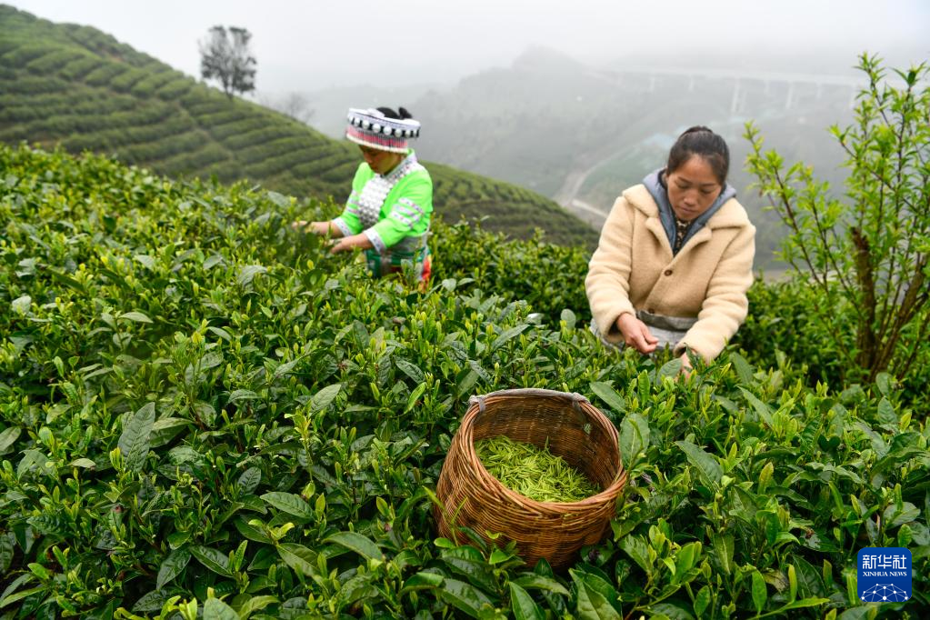 3月29日,贵定县云雾镇鸟王村的茶农采摘春茶。