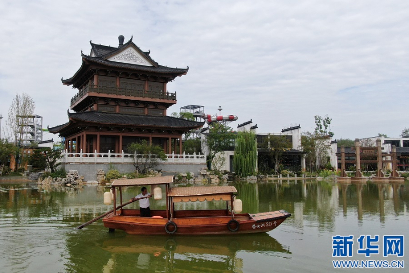 图为叶文生撑着摇橹船在景区内河河道上行驶。新华网 王凯丰 摄