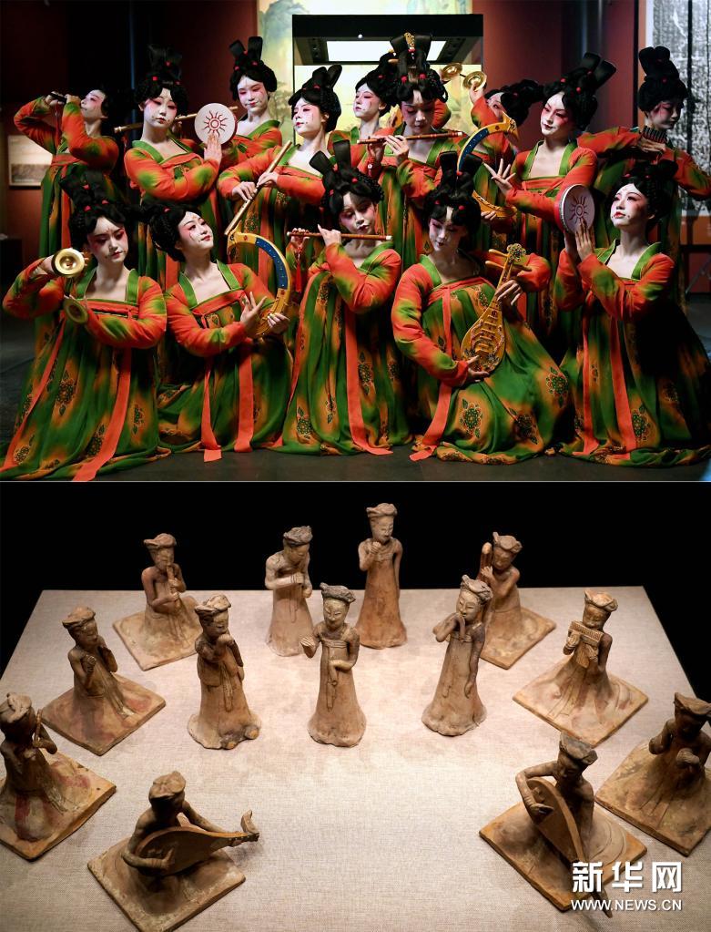 拼版照片:上图为郑州歌舞剧院的演员在录制河南博物院元宵奇妙夜节目(2月20日摄);下图为河南博物院主展馆内展出的展品(2020年9月24日摄)。新华社记者 李安 摄