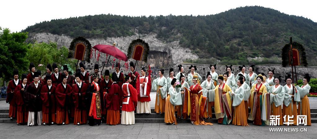 演员在洛阳龙门石窟景区礼佛台演绎龙门石窟《帝后礼佛图》(4月25日摄)。新华社记者 李安 摄
