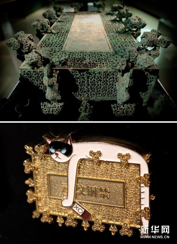 拼版照片:上图为2019年11月18日拍摄的河南博物院展出的“云纹铜禁”(新华社记者李安摄);下图为河南博物院推出的“云纹铜禁”文创产品(资料照片)。新华社发