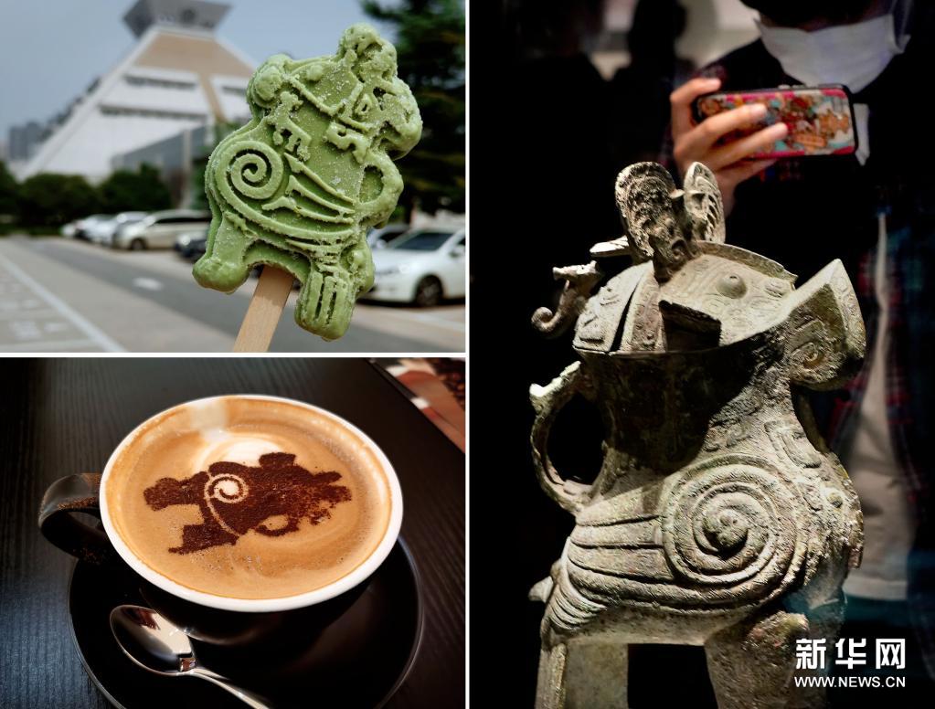 拼版照片:右图为2020年9月24日,参观者在河南博物院主展馆内拍摄展品“妇好鸮尊”(新华社记者李安摄);左上图为2020年9月24日拍摄的河南博物院推出的“妇好鸮尊”冰淇淋(新华社记者李安摄);左下图为2020年9月24日拍摄的河南博物院推出的“妇好鸮尊”图样咖啡(新华社记者李文哲摄)。新华社发