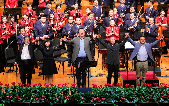 图为指挥家汤沐海、作曲家王丹红、作曲家郝维亚、作曲家张千一、作曲家郭文景演出谢幕。(由左至右)中央民族乐团 供图