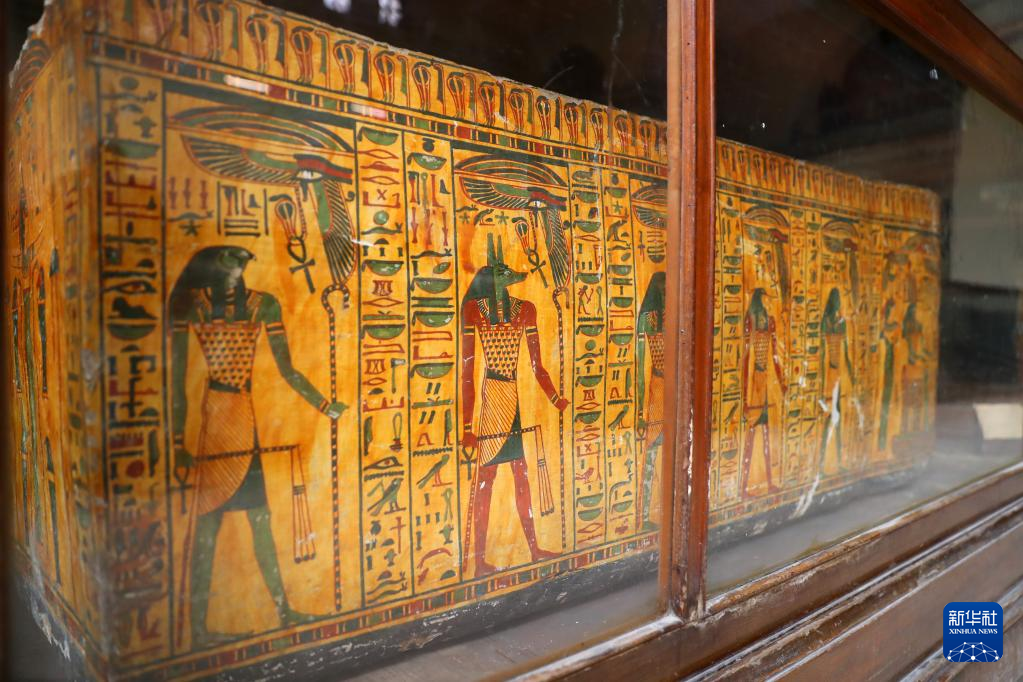这是5月14日在位于埃及开罗的埃及博物馆拍摄的绘有“阿努比斯”的木乃伊棺椁。