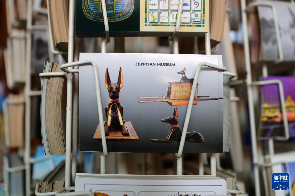 这是5月14日在位于埃及开罗的埃及博物馆纪念品店拍摄的以图坦卡蒙墓中出土的“阿努比斯”雕像为主题的明信片。