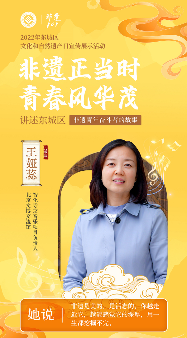 在王娅蕊看来,非遗是美的、是有魅力的,是活态的、是复杂的,是对人和社会有教育作用的。越走近它,就越能感觉到它的深厚,用一生都挖掘不完。因着被非遗的美和深刻所感动,多年来她一直和智化寺京音乐的传承人在一起,一方面做乐队的管理和服务,组织馆内外的展演宣传活动;另一方面不断学习和研究京音乐的文化价值、探索它的保护和发展出路。在此过程中,她也深受前辈的影响,感动于自己原来的主任孙素华女士用她的青春认真进行京音乐的保护,打开了京音乐的局面。于是王娅蕊也把自己的青春和智化寺京音乐这项非遗紧紧地联系在一起。