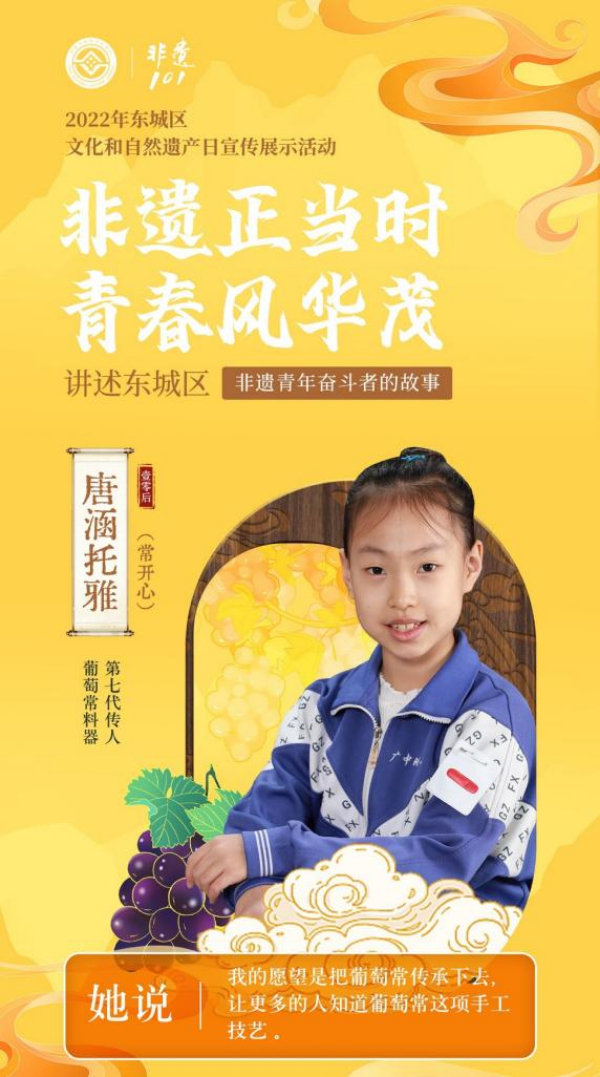 非遗传承,还有“10后”新生代接力。葡萄常料器第七代传承人常开心(唐涵托雅),今年只有10岁,在广渠门中学附属花市小学上学。她说起自家葡萄常的故事可谓是头头是道。