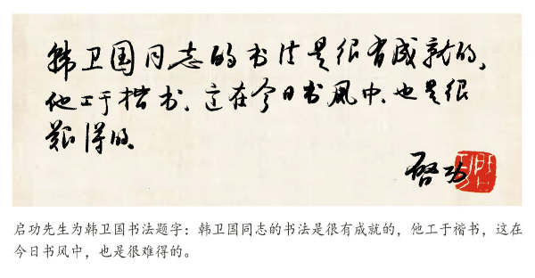 1987年,启功先生推荐韩卫国加入中国书法家协会,并郑重写下评语:韩卫国同志的书法很有成就。他工于楷书,这在今日书风中,也是很难得的。同意入会。