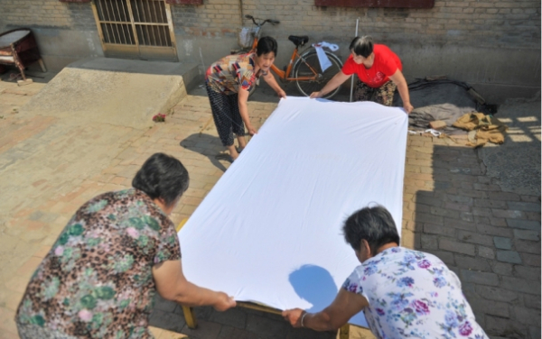 虎头鞋做工复杂,地道的虎头鞋全部手工缝制而成。首先要在春天糊袼褙,晾干后整张存放,使用时随时裁用。糨糊是用玉米面和少量面粉熬制而成,整个院子里都弥漫着浓郁的粮食香气。之后要经过剪裁底样、填制千层底、纳底切底边、剪裁鞋帮、绱鞋、楦鞋等数十道工序,再加上鞋面的绣工,制作一双鞋往往要花上五六天的时间。