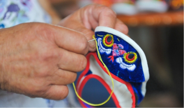 “我们这一带的虎头鞋鞋底通常为两层,代表好事成双;鞋底针脚要四组、每组八针,寓意四平八稳;虎须要缝五针,表示五谷丰登、五福临门;鞋跟上绣着的‘福’字,表示孩子有福气……”提起虎头鞋的制作,张晓芸如数家珍。