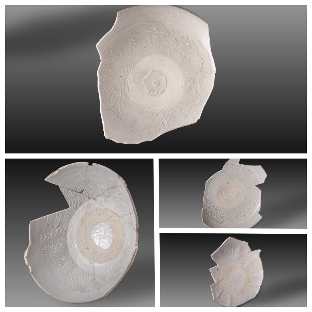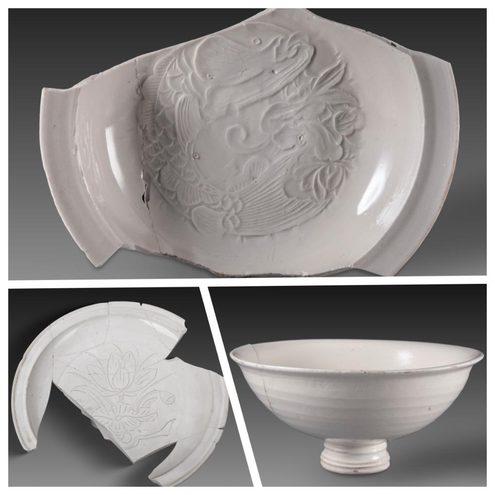 这是一张拼版照片:上图为元代细白瓷鱼纹印花盘;下左图为元代细白瓷莲花纹印花盘,下右图为元代细白瓷高足杯。
