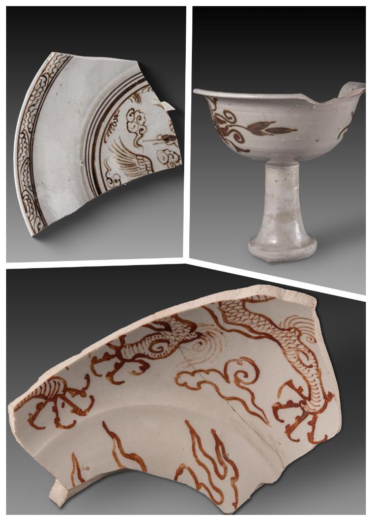 这是一张拼版照片:上左图为明代云鹤纹盘,上右图为明代白地褐花高足杯;下图为明代细白瓷矾红彩五爪云龙纹碗(藩王府用瓷)。