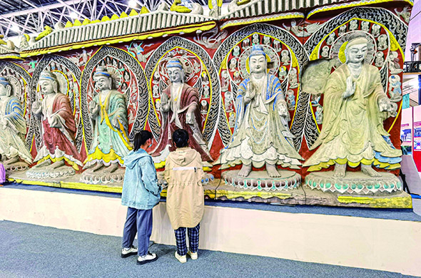 2023年10月19日,游客欣赏3D打印的云冈造像。新华每日电讯记者王学涛摄